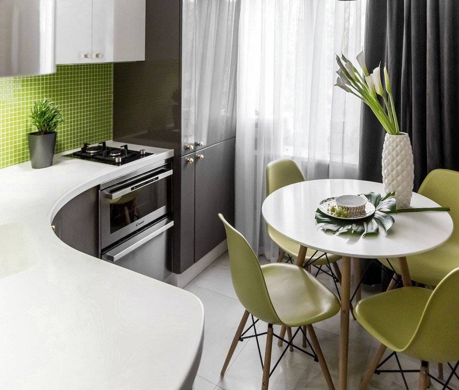 Решить задачу можно, используя выдвижные поверхности или раскладные комбинации. Например, столешница может быть продолжением подоконника или выдвигаться из шкафа, в котором спрятана посудомоечная машина. За таким выдвижным столом смогут расположиться 3-4 человека. Стулья для небольшого помещения лучше покупать раскладные, чтобы их можно было убирать после еды.