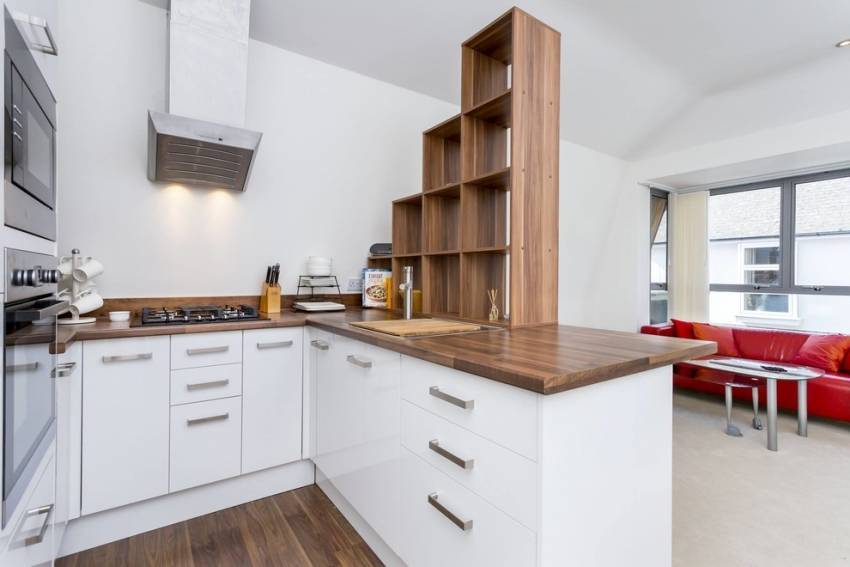 Пример зонирования кухни в квартире-студии с помощью полок-стеллажей