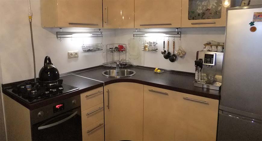 Угловая планировка наиболее оптимальна для маленькой кухни.