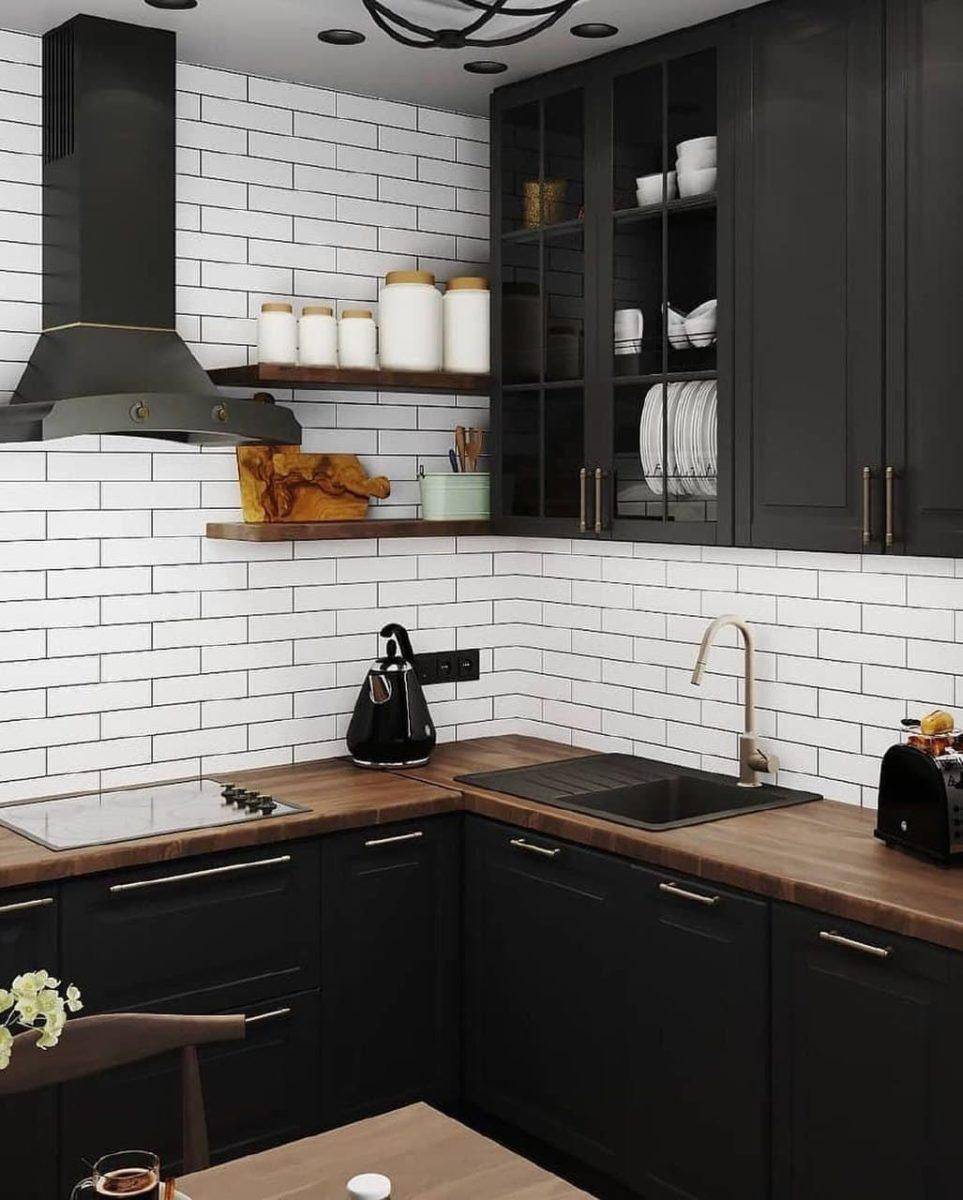 Кстати, темные оттенки особенно хороши на вертикальных поверхностях, например, в фартуке, в оформлении одной акцентной стены или на фасадах гарнитура. Фокус в том, что черный в окружении более светлых оттенков будто утапливается, придавая пространству объем и глубину.