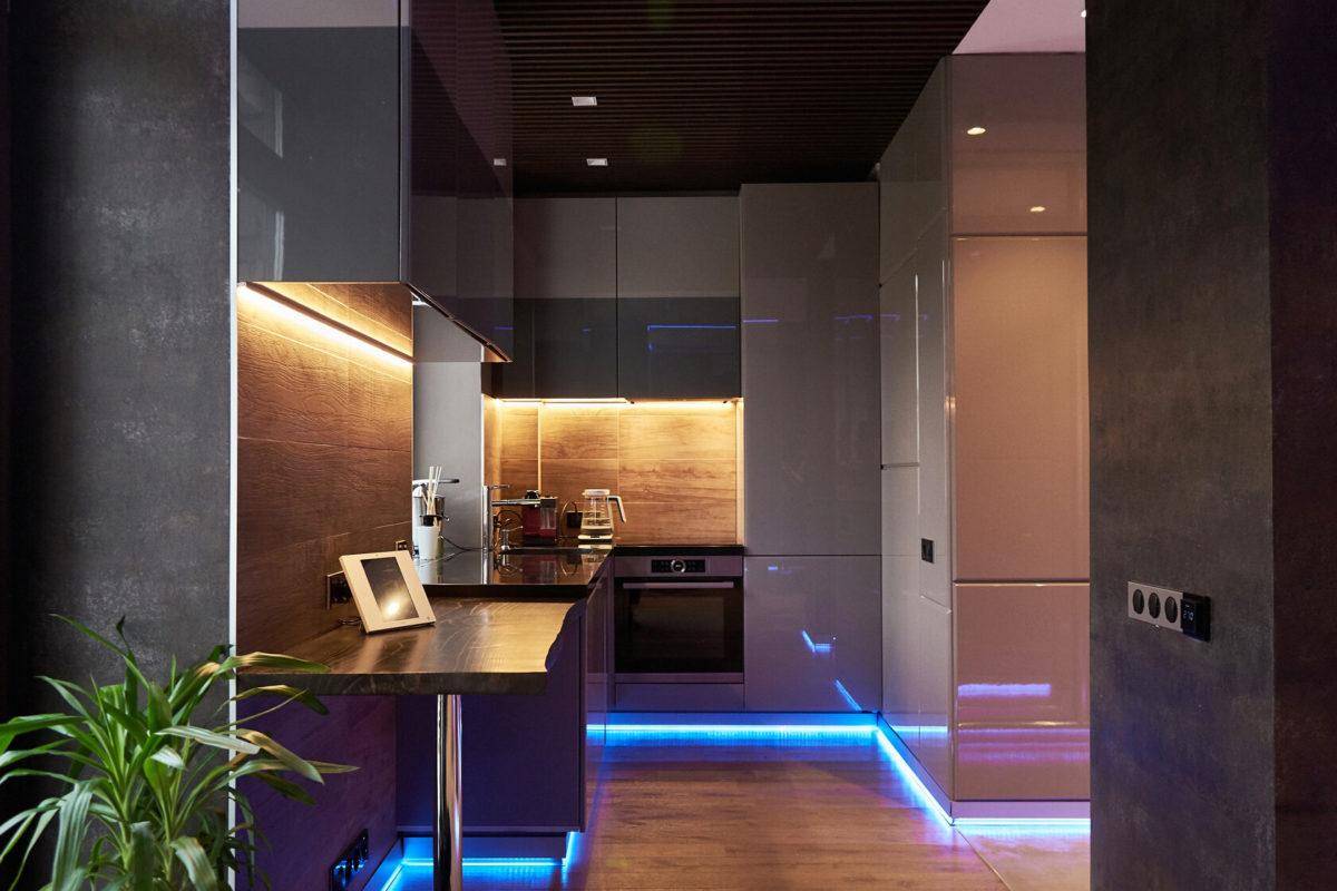 Фасады с фрезеровкой и подсветкой. Встроенные холодильник, посудомоечная и стиральная машина.