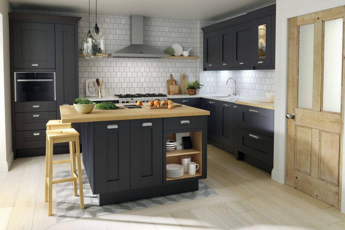 Такие тёмные кухни будут уместны как в классических интерьерах, так и в некоторых современных стилях, например, лофте. Фасады изготавливаются из деревянного массива либо шпона таких пород, как морёный дуб, тёмный орех, венге. Они могут быть гладкими или филёнчатыми.