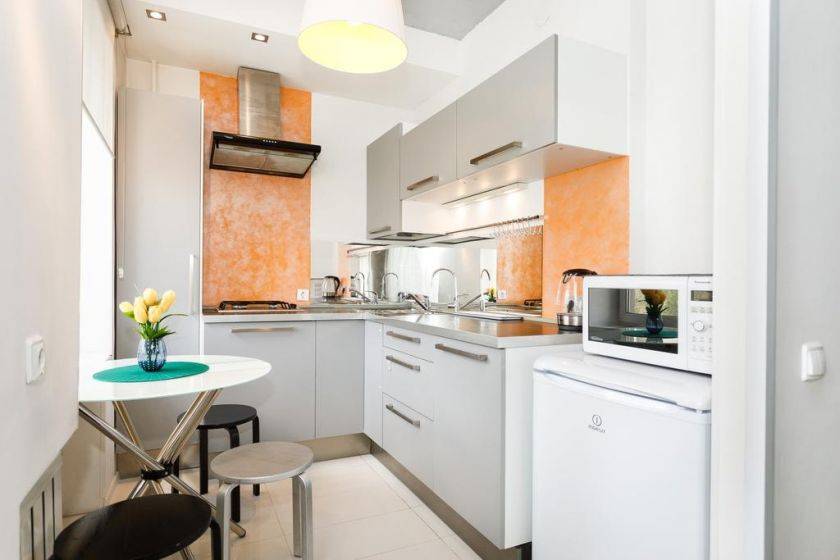 Это вариант наиболее удобен именно для приготовления блюд и хранения всех кухонных аксессуаров и продуктов, размещения бытовой кухонной техники. Центральная часть кухни остается свободной. Однако для обедов и ужинов таковой дизайн кухни в маленькой квартире не подходит, так как для приема пищи элементарно нет места даже у стены. Накрывать стол нужно в столовой (чего нет в маленьких квартирах) или гостиной. Так что не забудьте приобрести сервировочный столик на колесиках или сделать раздаточное окошко в комнату.