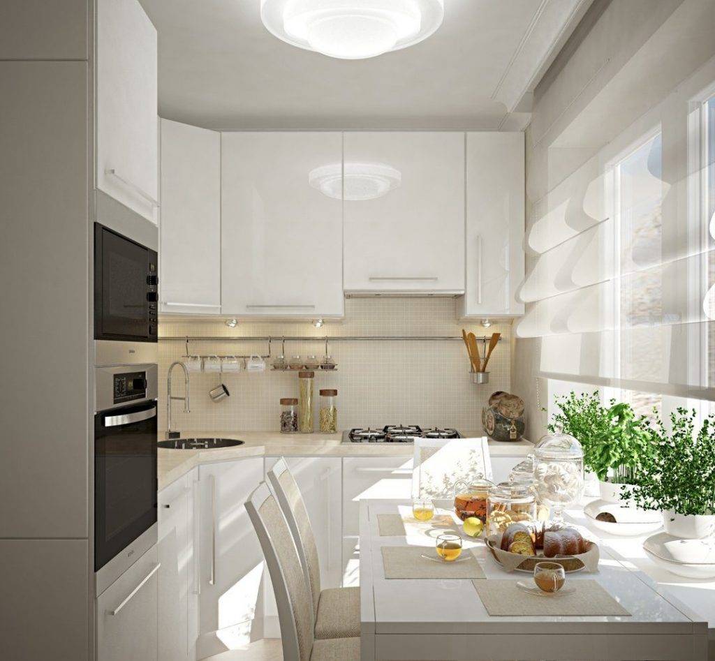 Выбирая кухонный гарнитур для кухни, нужно обращать внимание на Г-образные или прямые модели, устанавливаемые вдоль стены. Ни в коем случае нельзя покупать гарнитуру, выполненную на букву П — после ее установки на кухне практически не останется места, останется лишь узкий проход. Отличным решением для маленькой кухни станет гарнитур с множеством скрытых полок и ящиков, в который поместится не только вся кухонная утварь, но и бытовая техника