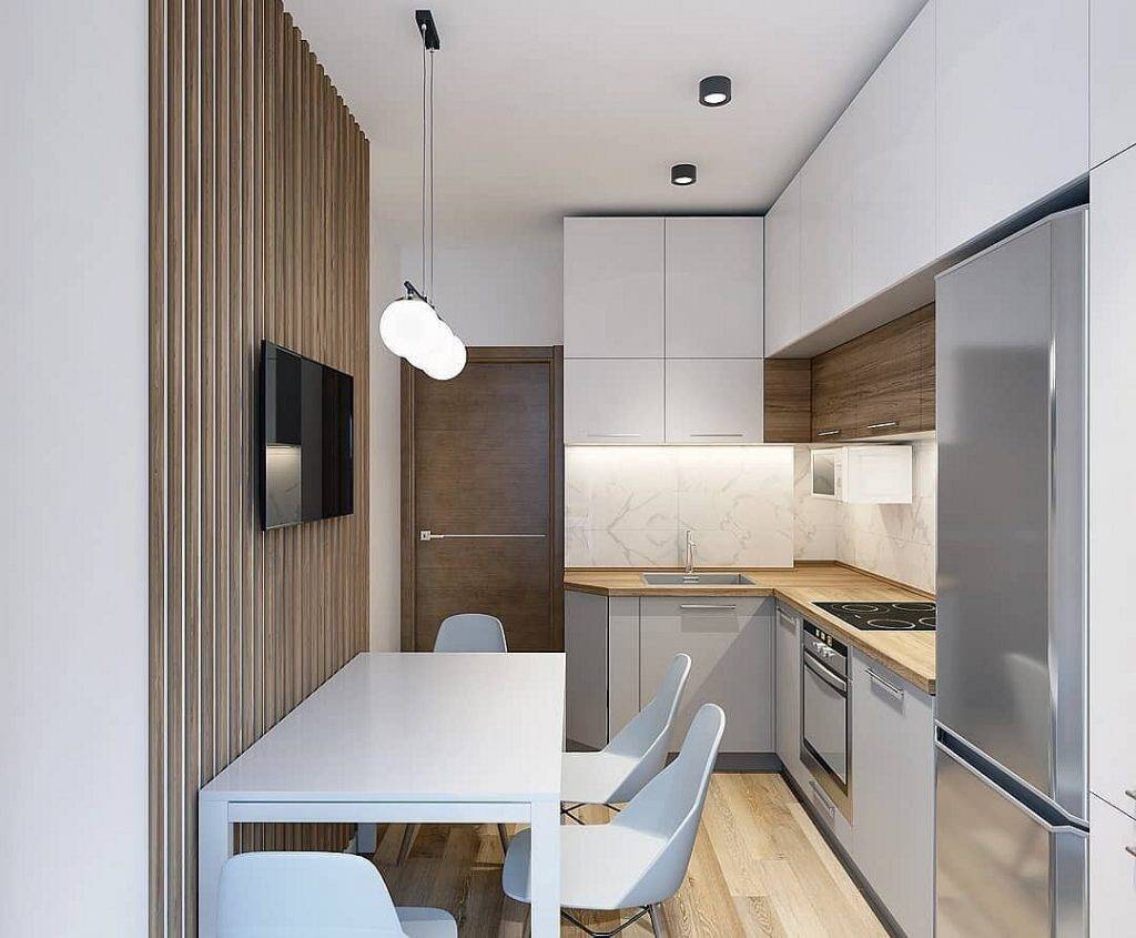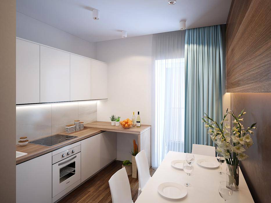 В обустройстве кухонь на 9 квадратных метров есть два основных типа: квадратная и прямоугольная. В квадратном варианте ставится угловая кухня — это наиболее выигрышный вариант. При прямоугольном расположении кухню часто ставят в один ряд. Его редко кладут на стену с окном и делают барную стойку или расширяют рабочую поверхность до одного уровня.