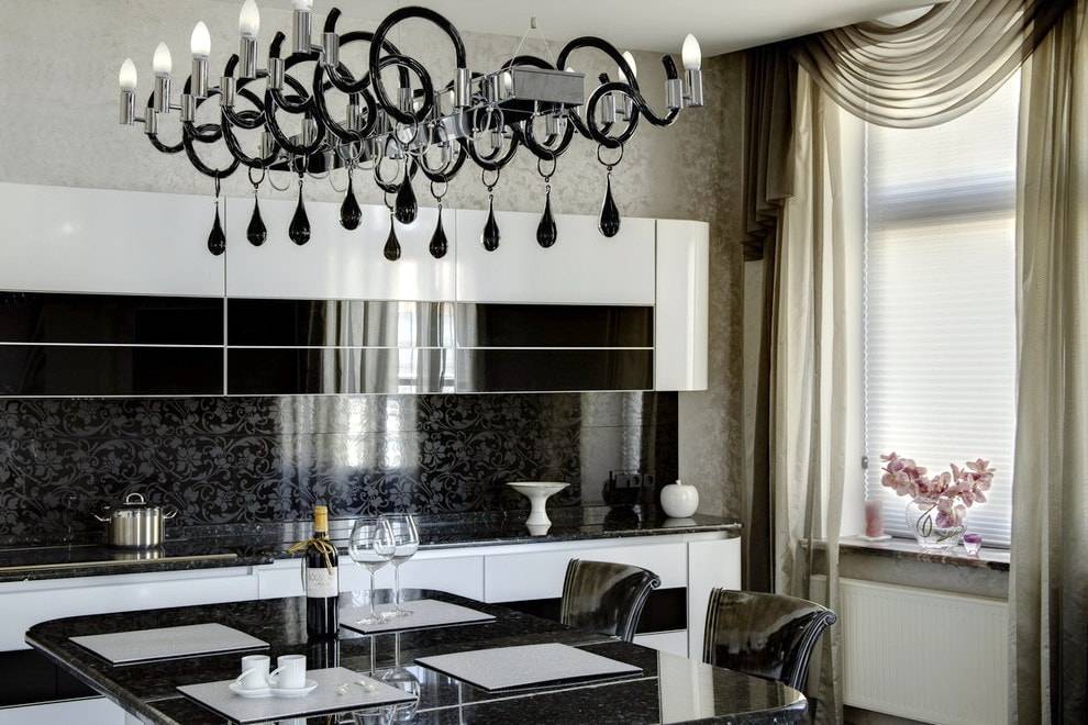 Размер обеденного стола зависит от того, сколько человек проживает в квартире. Если обеденная зона предназначена для быстрого перекуса, следует установить стильную барную стойку со складными стульями.
