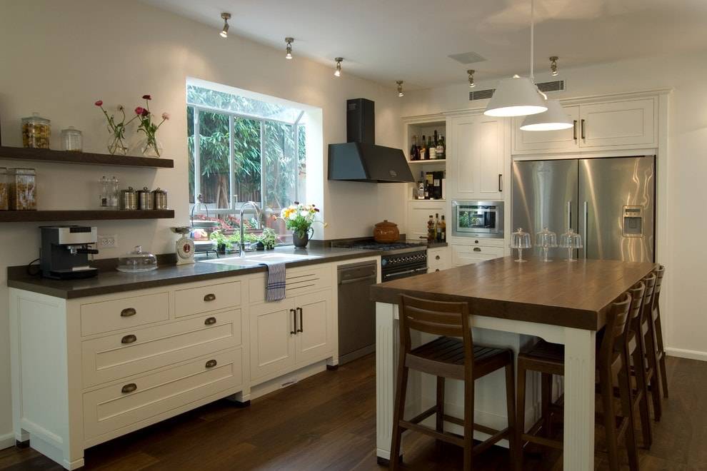 Универсальным считается угловой тип — он экономит пространство. Подойдут П-образные, линейные типы кухонь. Полуостровной тип хорошо справляется с зонированием пространства. На такой кухне много рабочих поверхностей. Этот вариант позволяет разместить много бытовой техники. Такой тип сам по себе зонирует пространство.