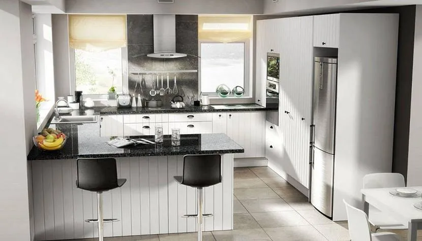 - Устанавливать кухонный гарнитур п-образной формой. Такой формат только загромоздит пространство и будет препятствовать свободному передвижению. Для открытого пространства подойдет установка мебели и техники либо в линию, либо в г-образную форму.
