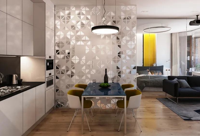 На фото – дизайн кухни-гостиной в 20 кв. м с зонированием раздвижными перегородками.