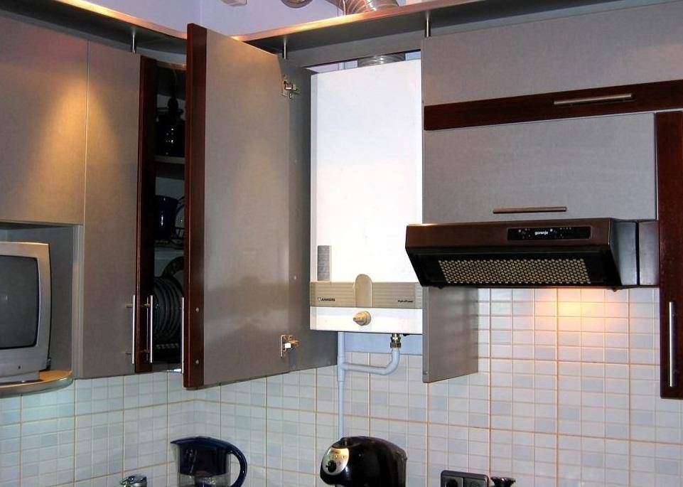 Обычно уже на этапе заказа и покупки мебельного гарнитура для кухни ставят вопрос о необходимости отдельного шкафчика для газовой колонки. Производители мебели часто сталкиваются с такими индивидуальными запросами и по необходимым габаритам выполнят короб, который по своему внешнему виду не будет отличаться от кухонного гарнитура. Таким образом, получается единое оформление, которое не нарушается внешним видом конструкции котла.
