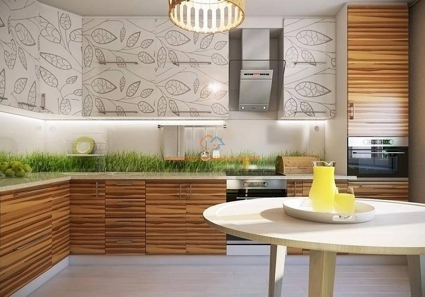 Использование зеленых и голубых тонов — основной принцип при создании кухни в современном стиле эко. Можно имитировать живую природу, расположив на подоконнике искусственную траву или настоящие растения. Перьевой лук, петрушка, салат, базилик — настоящая находка для хозяйки, которая часто готовит. Зелень станет деталью интерьера, если посадить в красиво оформленные продолговатые горшки. Для создания более экзотического оформления подойдут фотообои с изображением бамбука, тропических растений или джунглей. Потребуется черный или бежевый гарнитур, который будет выделяться на фоне рисунка.