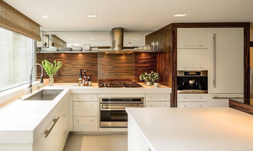 Встретить угловую кухню с большим окном в частном доме можно в современных архитектурных стилях. В них приветствуется минимализм и много стекла в оформлении. Есть несколько вариантов интерьера, если на кухне большое вытянутое по форме окно: