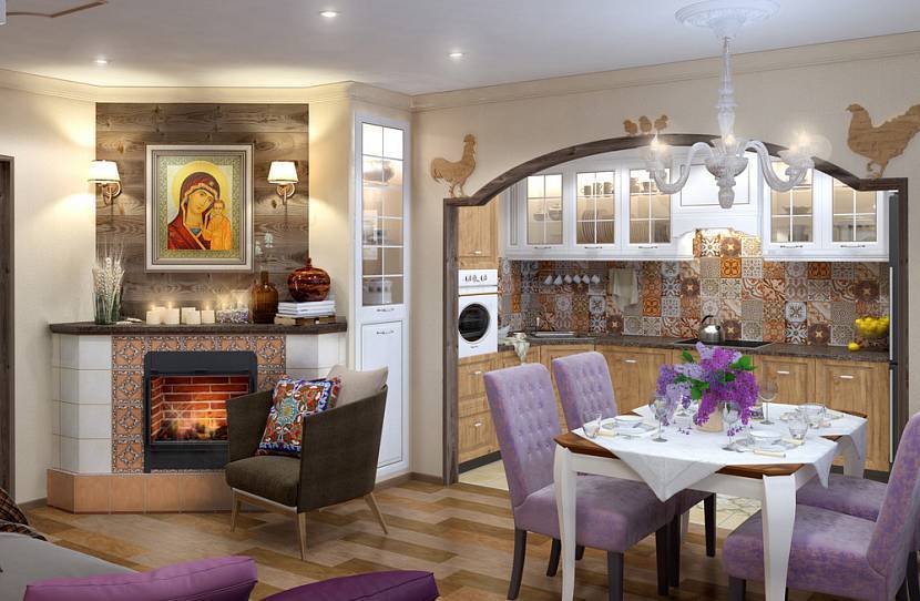 Кухня, совмещенная с гостиной, в русском стиле с каминомИсточник comfortoria.ru