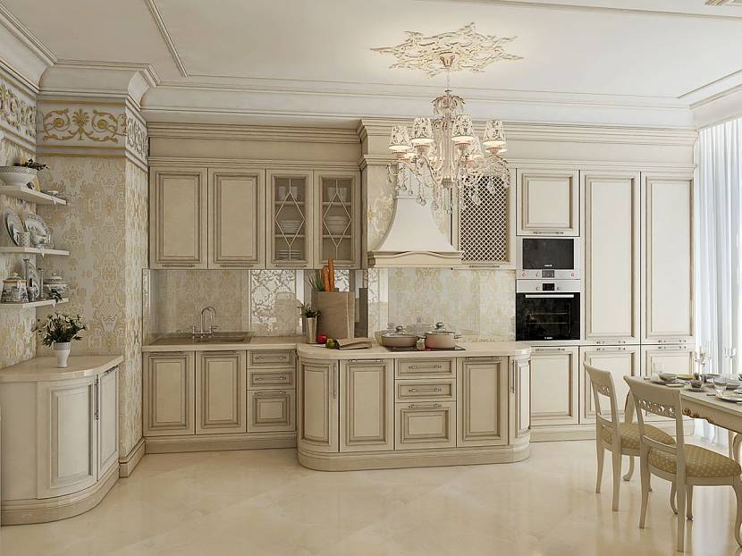 Для интерьера кухни в классическом стиле потребуется просторное помещение и умножение суммы, запланированной на ремонт, в 1,5-2 раза. При оформлении приветствуются кружева, изящные детали и имитация лепнины. Дополнит дизайн элегантная объемная лампа.