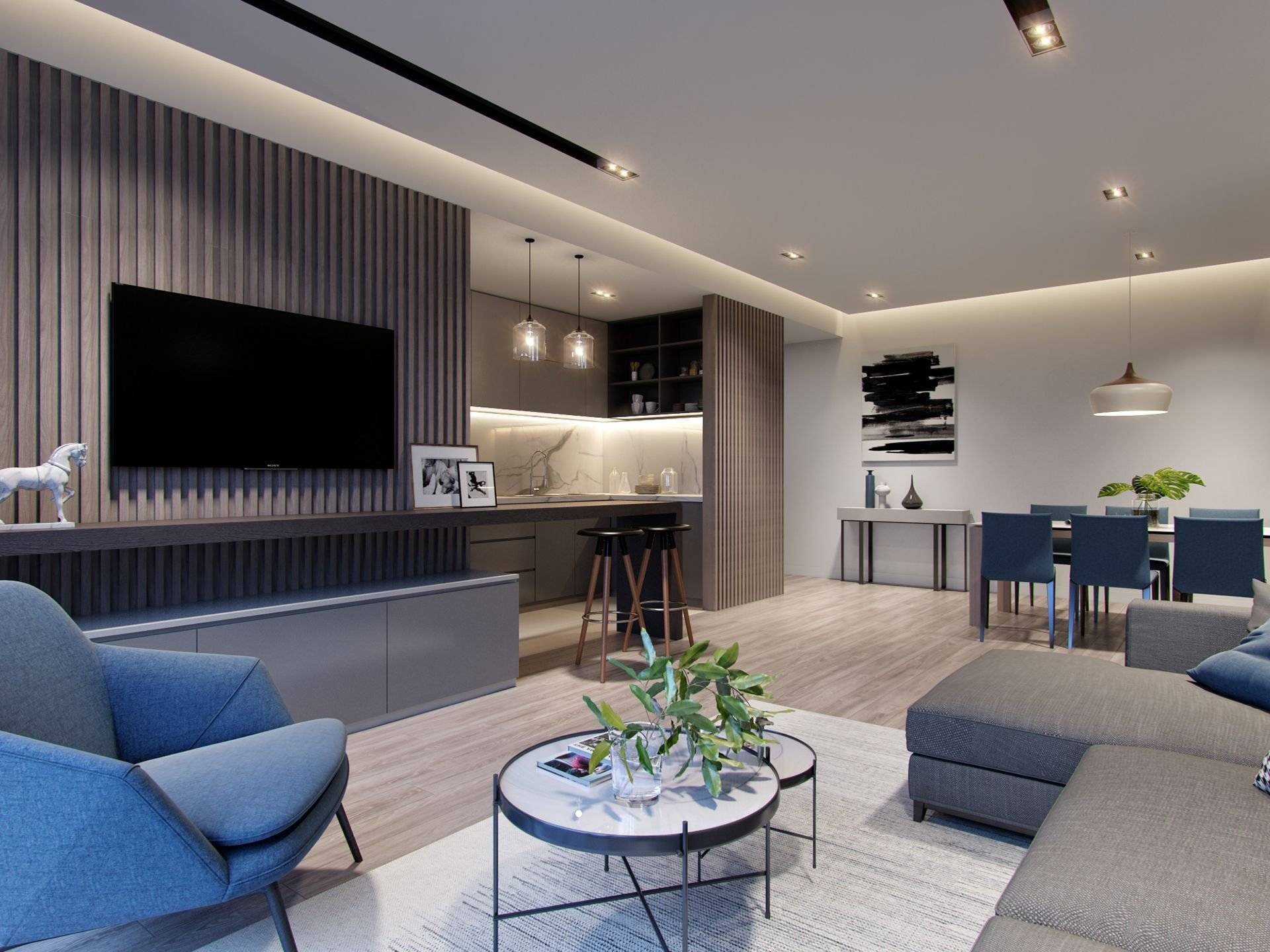 Барная стойка между залом и кухней — удачный вариант зонирования. Он подходит как для просторных помещений, так и для комнат с более скромной площадью.