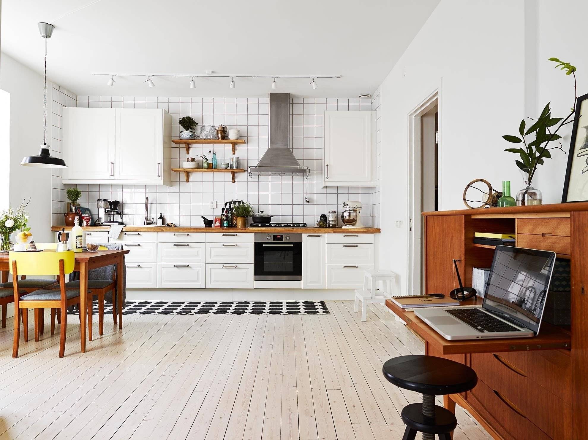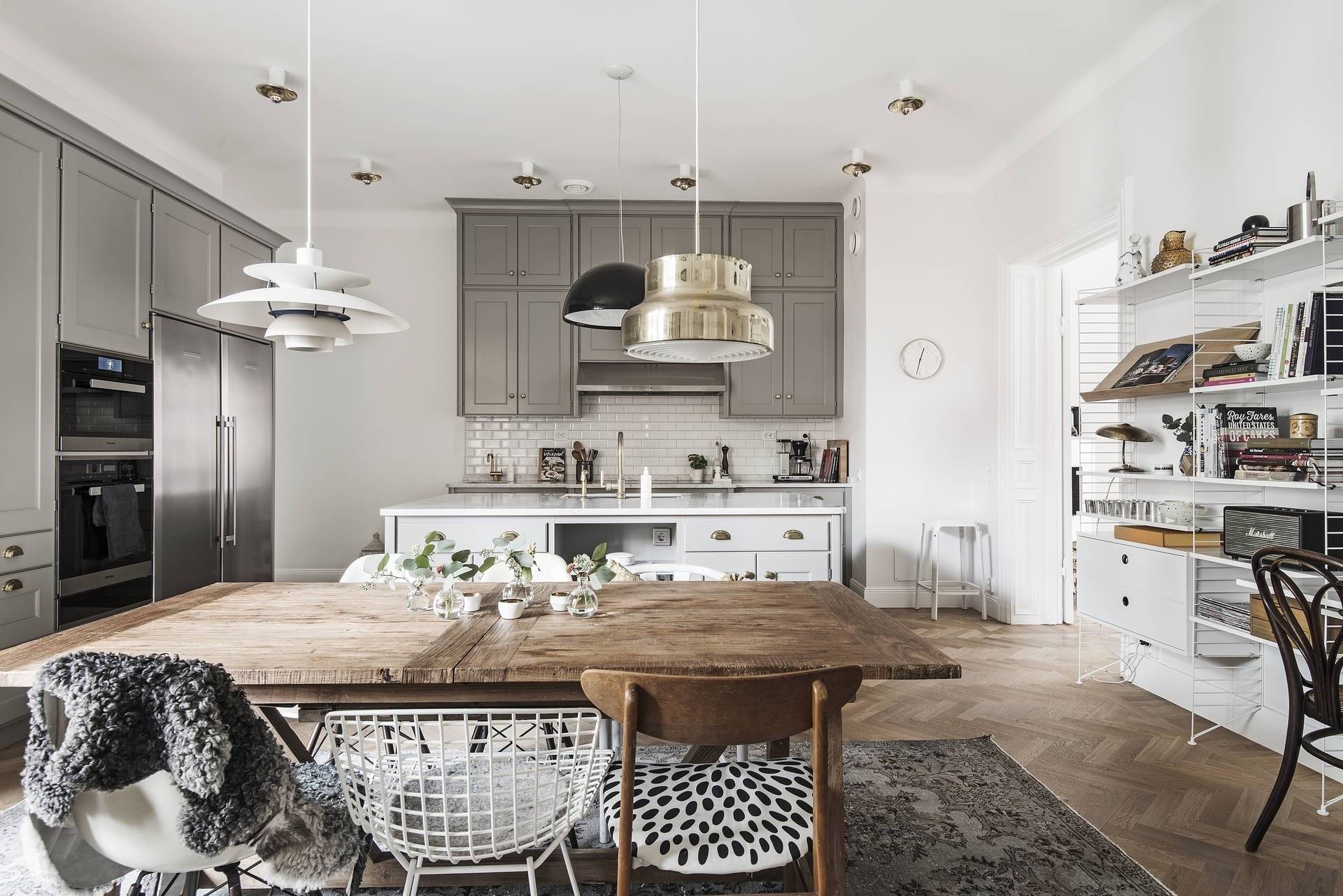 Например, участки стен или фартуки могут имитировать кирпичную кладку. Главное, чтобы кирпичи были белыми. На потолке часто можно увидеть балки «под дерево», а пол будто сделан из досок. Очень органично на кухне, объединенной с гостиной, смотрится обеденный стол из практически необработанного дерева. В качестве декора подойдут шкуры животных, рога на стене, текстиль со скандинавскими этническими узорами и т.д.