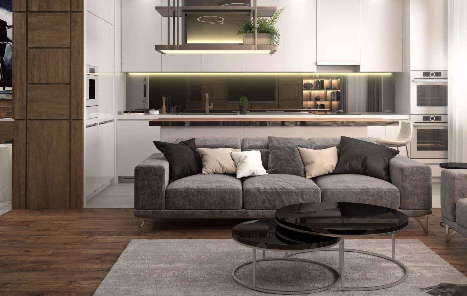 – кресла, диваны – красиво будет смотреться, если все оттенки дизайна кухни-гостиной в современном интерьере будут повторяться в дизайне дивана, в обивке подушек и одеял. Таким образом, кухня максимально плавно перетекает в гостиную, и все помещение выглядит гармонично;