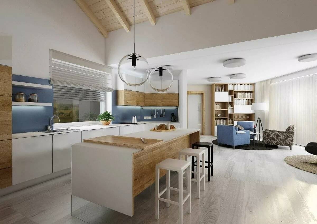 Данное направление в дизайне интерьере объединяет в себе уют и функциональность. На стыке кухни и гостиной можно разместить широкую барную стойку из натурального дерева. Таким образом, получится не только разделить пространство, но и создать дополнительное место для приготовления и принятия пищи.