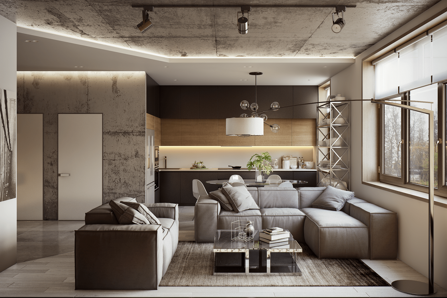 Этот стиль подходит обладателям квартир с высокими потолками. Его отличительными особенностями являются открытая планировка и совмещение разных архитектурных решений. Потолки и стены в таком помещении имеют грубую отделку. Конечно же, в огромном пространстве необходимо использовать зонирование. Вот с этой функцией в кухне-гостиной и справится барная стойка.
