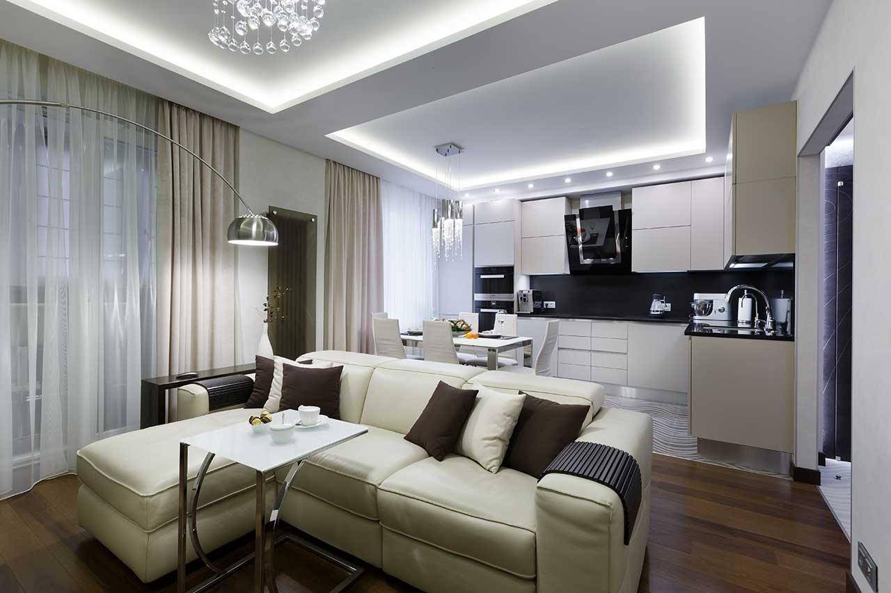 Интерьер кухни-гостиной в современном стиле – решение, которое понравится людям, предпочитающим уникальные аксессуары. Микс разных стилей, преобладание «мраморной» отделки и мягкой обивки кресел, а также бархатистых диванов, оригинальные светильники, аутентичный декор, новаторская техника – всё это гармонично сочетается в современном дизайне комната и кухня.