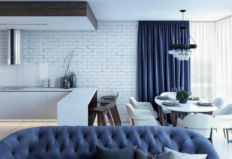 Очевидно, что площадь в 50-60 кв. м позволяет реализовать любую идею организации пространства. Такая кухня-гостиная может включать обширную рабочий кухонный блок, островной гарнитур, роскошную зону отдыха и другие территории. Например, дизайн студии должен быть разработан с учетом обустройства спального места, ведь в однокомнатных апартаментах для спальни нет отдельного помещения.