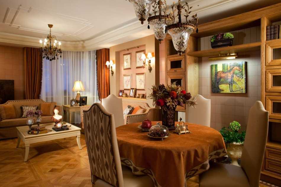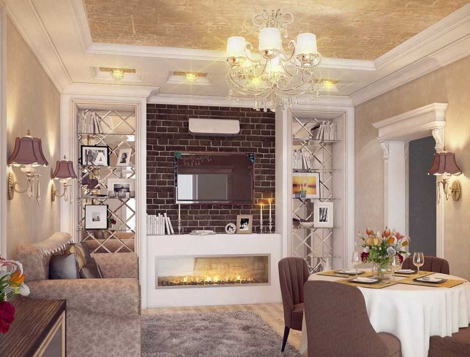 Сложно себе представить классическое пространство без большой многоярусной люстры, которая добавит роскоши интерьеру. Приветствуется обилие текстиля, также из натуральных материалов. Шторы могут быть тяжелыми, украшенными ламбрекенами и прочими украшениями. Отлично впишется в интерьер камин.