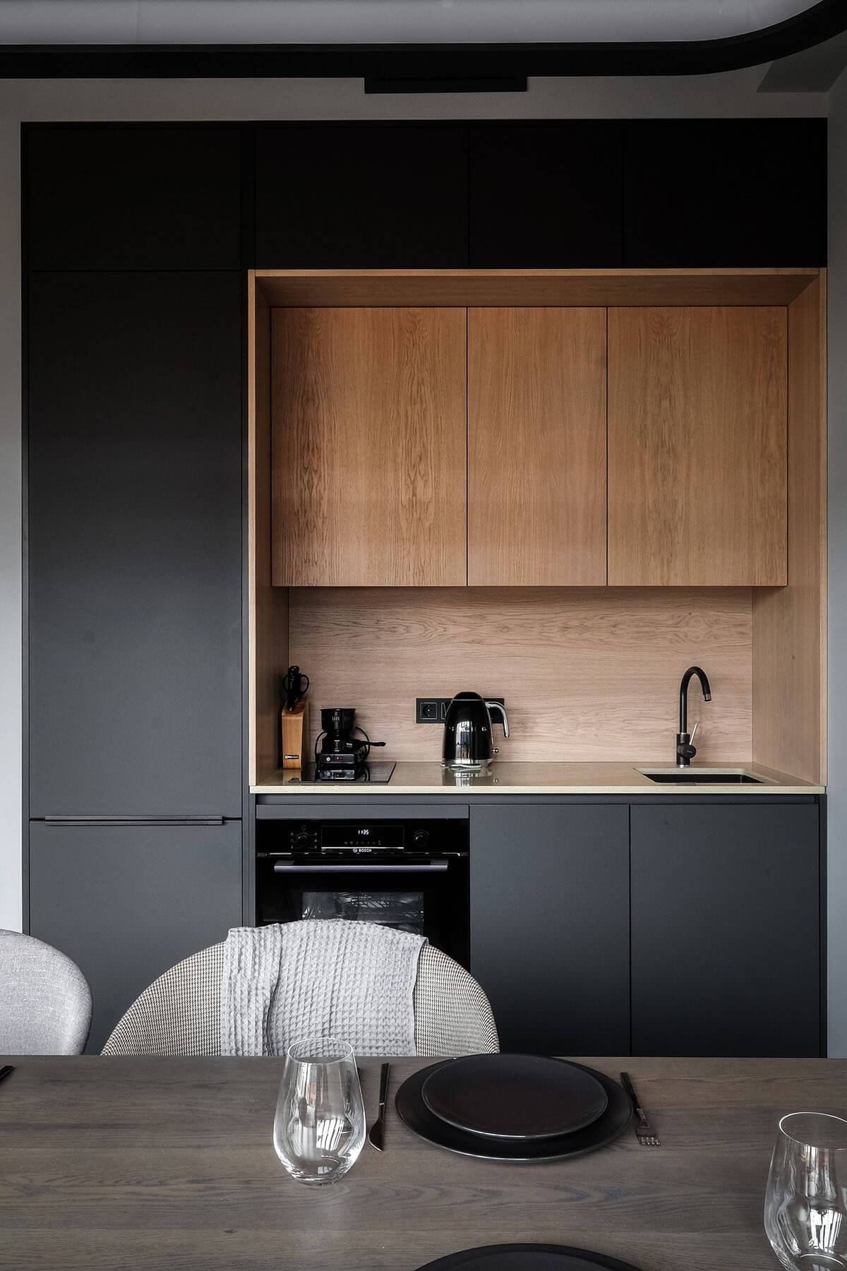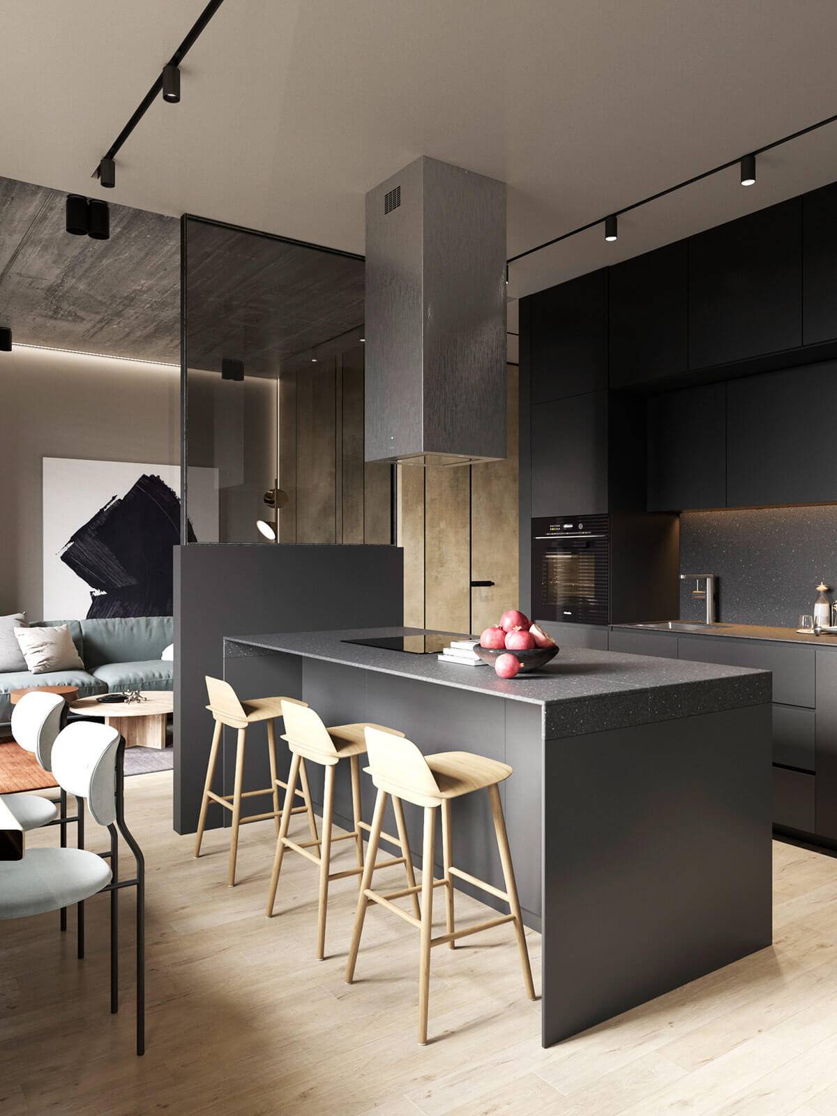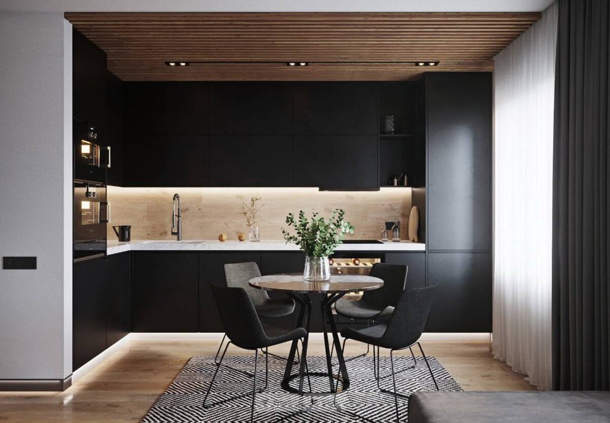 У черного цвета также есть оттенки. Создавая дизайн кухни, рекомендуется выбирать цвет древесного угля. Это значит, что черные поверхности должны иметь легкий блеск, но не быть зеркальными.
