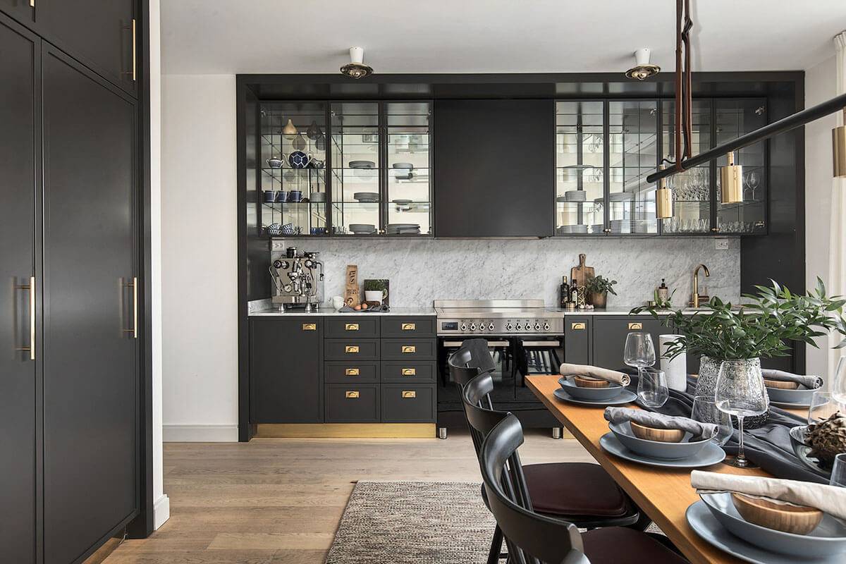 Черные кухни с золотой фурнитурой и сантехникой выглядят роскошно.