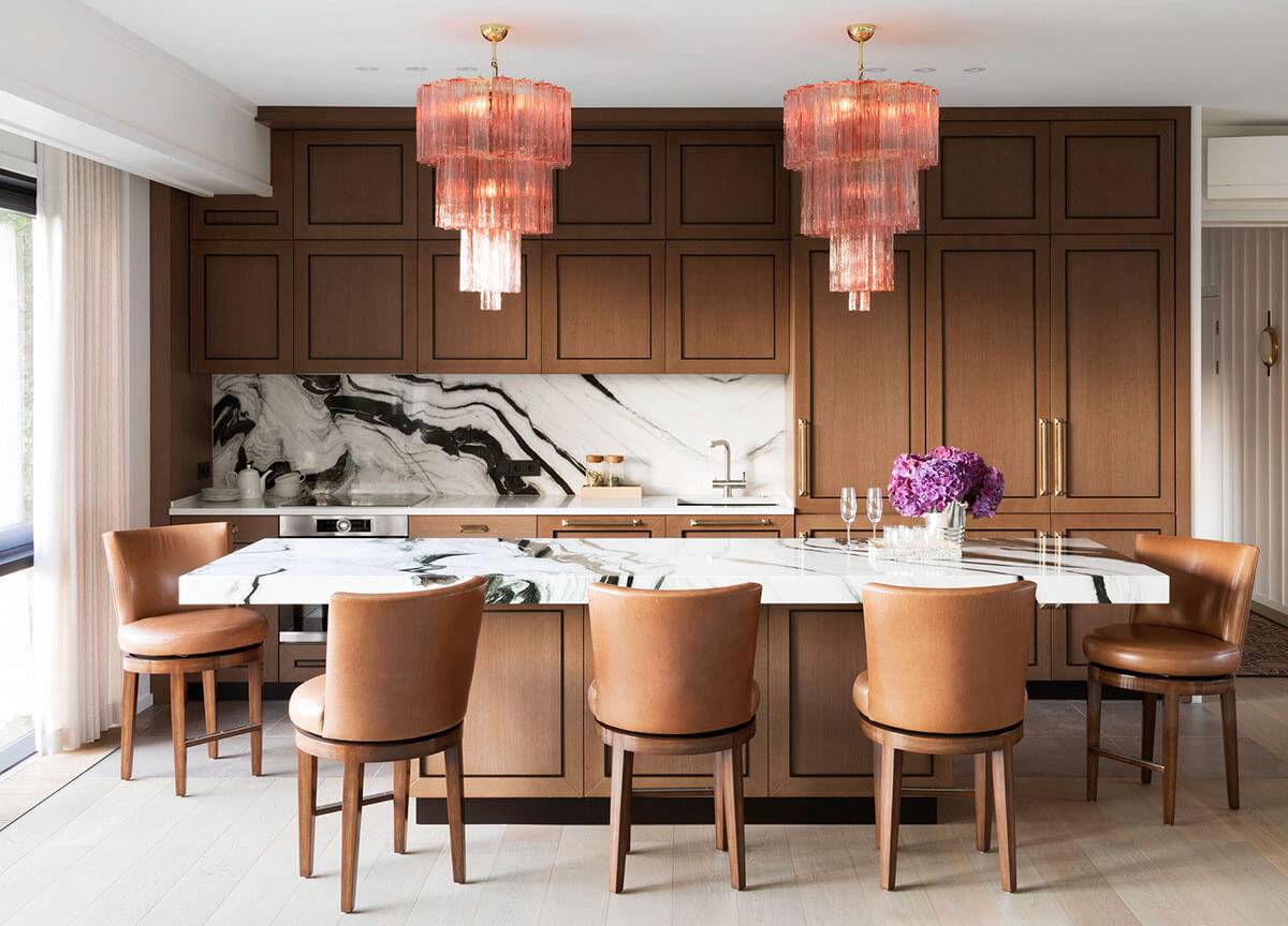 Прекрасное решение кухни в различных оттенках коричневого и беж. Для их отделки выбирается полированный травертин, мрамор и оникс соответствующих оттенков. Они прекрасно сочетаются с цветом неокрашенной древесины, из которой изготавливаются системы хранения с очень простым и лаконичным дизайном.
