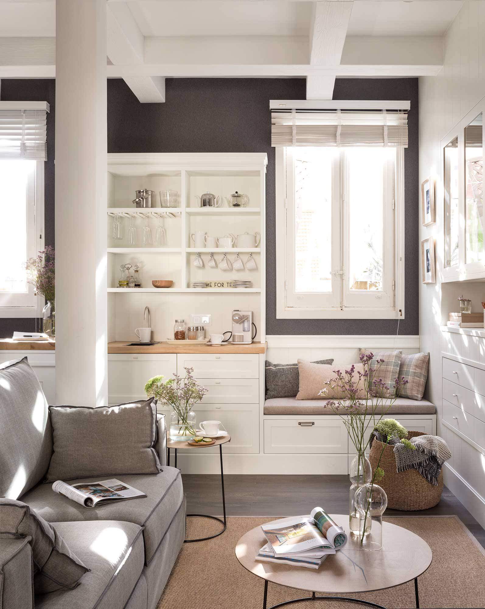 В маленькой по площади комнате тоже можно поставить стойку. Если выбрать не простую, а мультифункциональную, то она заменит не только обеденное место, но и кухонные полочки для хранения посуды и продуктов.
