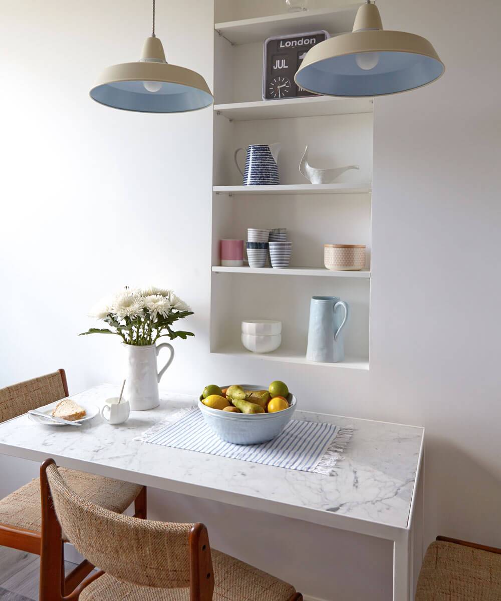 Сделать атмосферу более уютной и домашней помогут текстильные элементы или самые обыкновенные деревянные полки с красивой посудой.