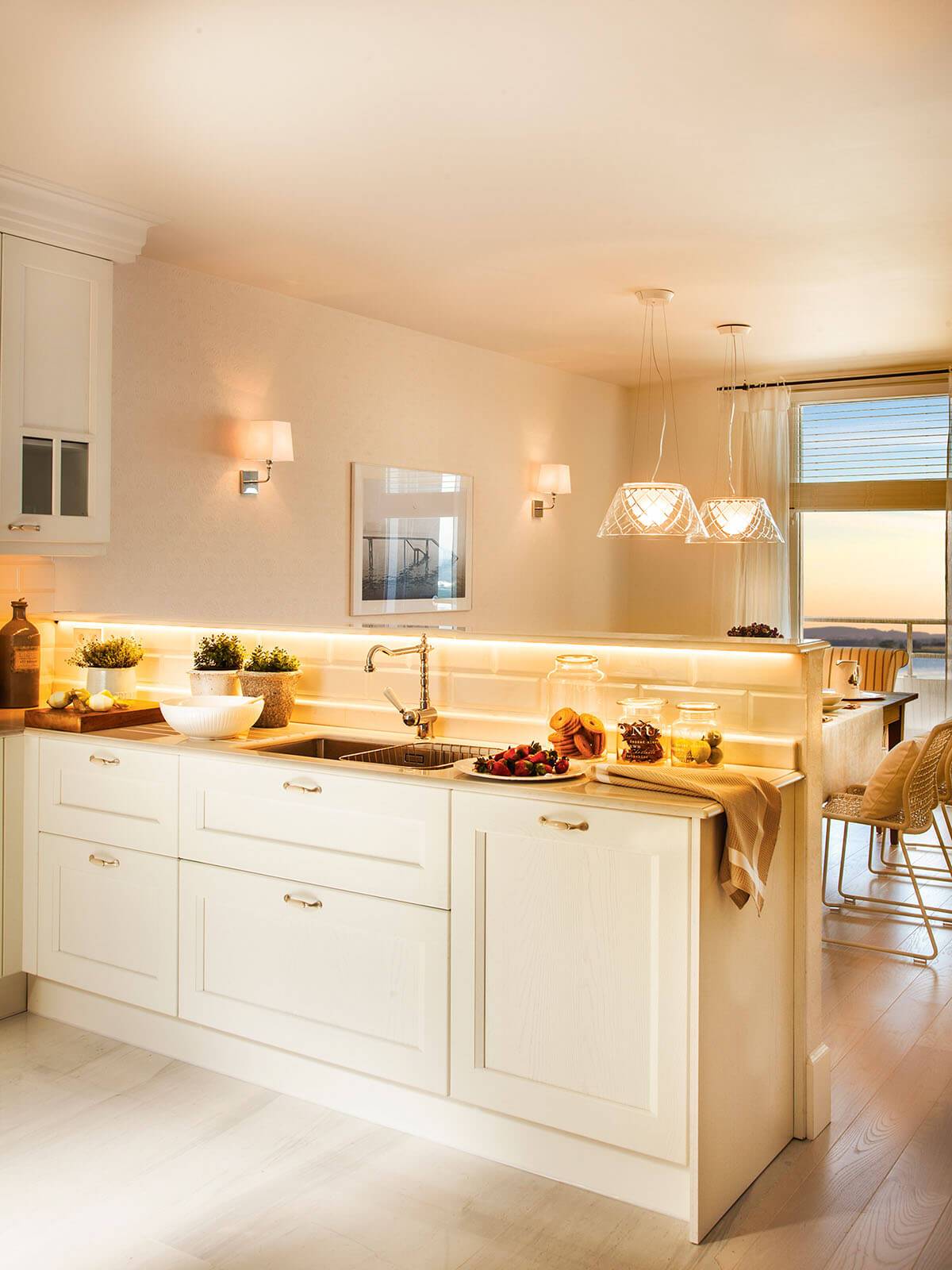 Уделите внимание всем зонам, но по возможности избегайте габаритных светильников. Оптимальное решение – рассеянное освещение: точечные лампочки в потолке или слоты над рабочей зоной и обеденной группой