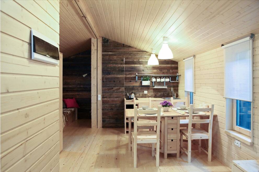 Бревенчатые светлые декорации и новая мебель, изготовленная в старинном дизайне, создают атмосферу былой эпохи с новаторским акцентом, и все благодаря подсветке, плитке и столу.