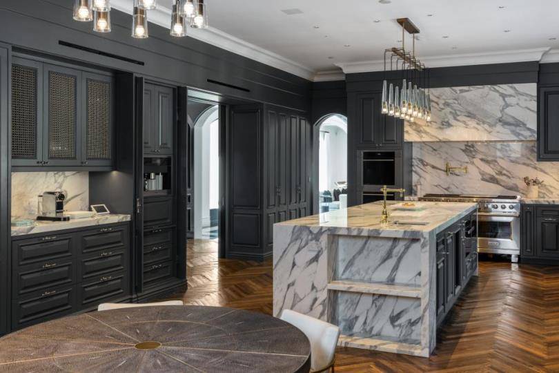Шикарный дизайн кухни в частном доме в бежевых оттенках отличается своей красивой зоной фартука с геометрическим орнаментом и бронзовым акцентом. Черные элементы в мебели идеально подчеркивают современный стиль.
