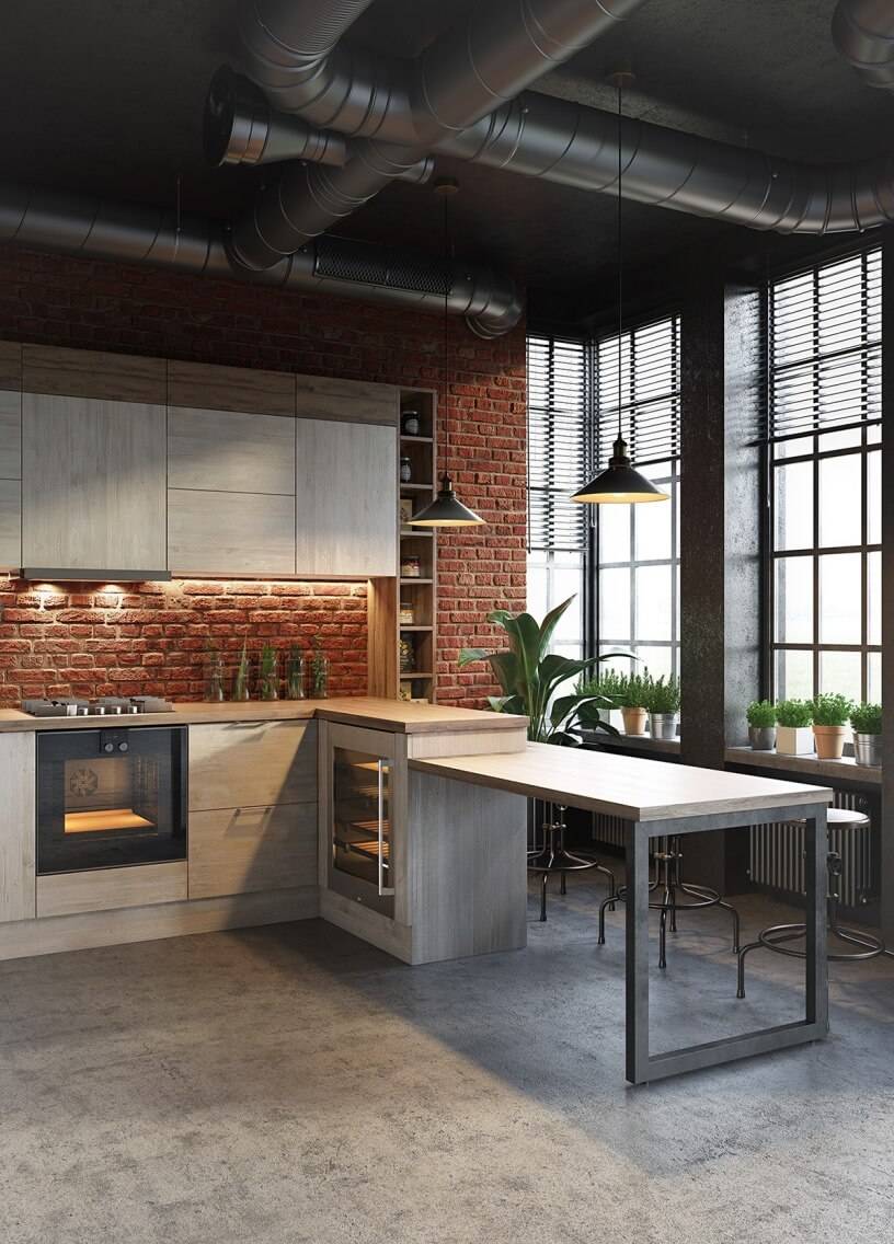 Один из самых популярных вариантов – кирпичная кладка. Мебель деревянная с грубой обработкой. Столешницы можно сделать из нержавеющей стали.