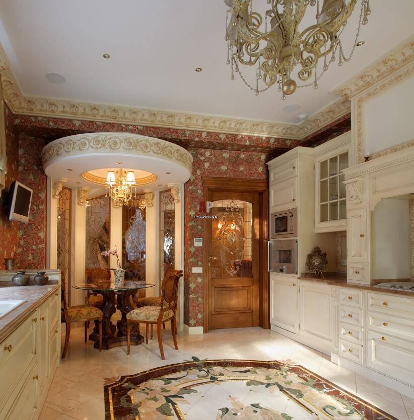 В обоих стилях соблюдается симметричность и пропорциональность, четкость центра. Кухня формируется вокруг «острова» – обеденного стола. Традиционные цвета – пастельные оттенки. Белый фон сочетается с золоченным декором.