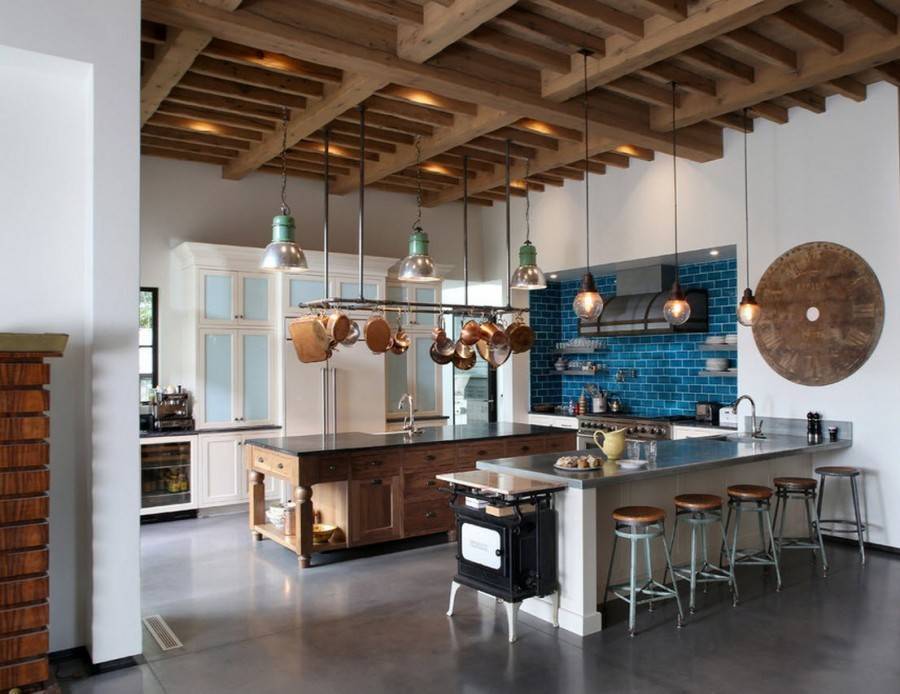 Здесь есть несколько стилей — модерн (барные табуреты), деревенский стиль (открытые полочки, керамика рустикальная обшивка стойки и мебельных фасадов), лофт (балки, стойки и светильники), современный стиль (хромированная техника, столешницы из искусственного камня и смеситель на мойке).