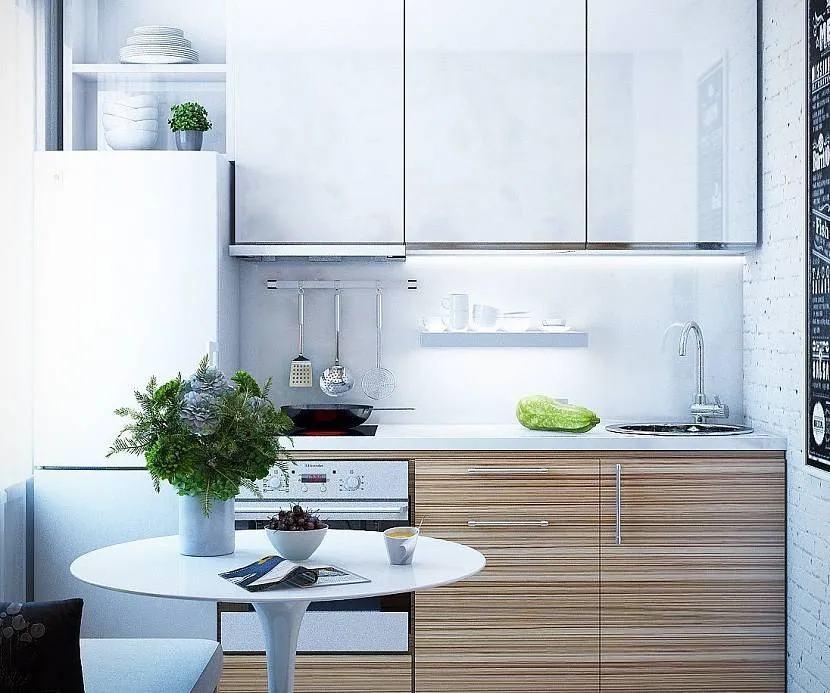 Кухня, даже самая маленькая, должна сохранять свою функциональность. Здесь обязательно должны присутствовать стол, холодильник, варочная панель, места для хранения посуды и утвари.