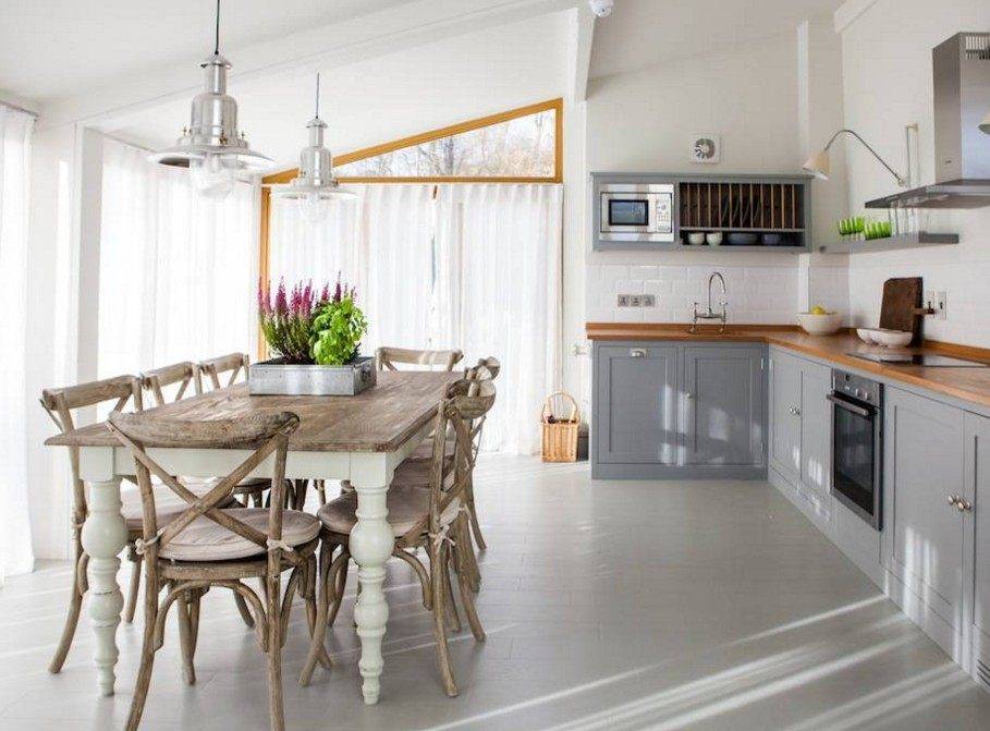 Этот стиль одинаково хорошо подходит для оформления как небольших кухонь в квартирах, так и просторных помещений загородных домов. Поскольку он предполагает использование светлых тонов, с его помощью можно визуально расширить комнату.