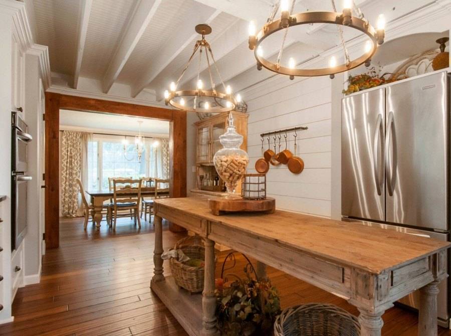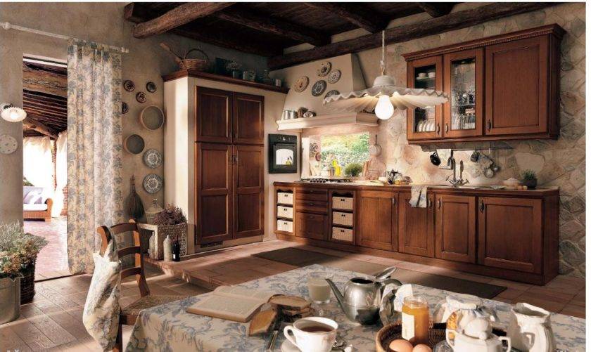 Натуральное дерево и камень, ткани и даже оттенок камина. Все должно быть максимально приближено к быту деревенской кухни.