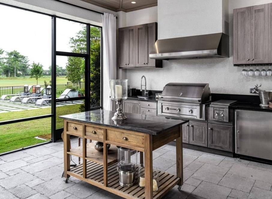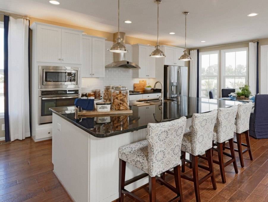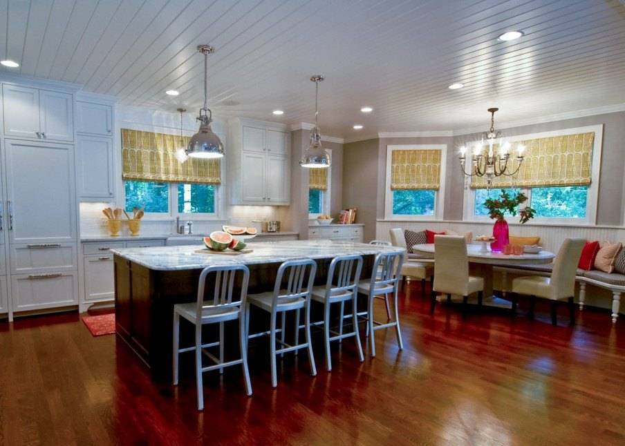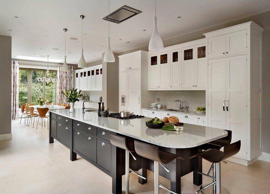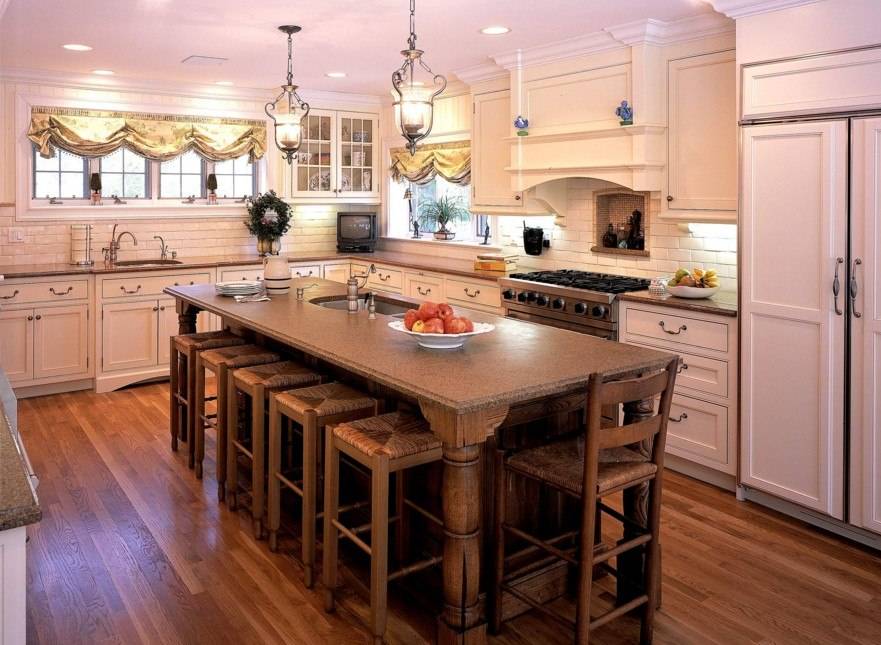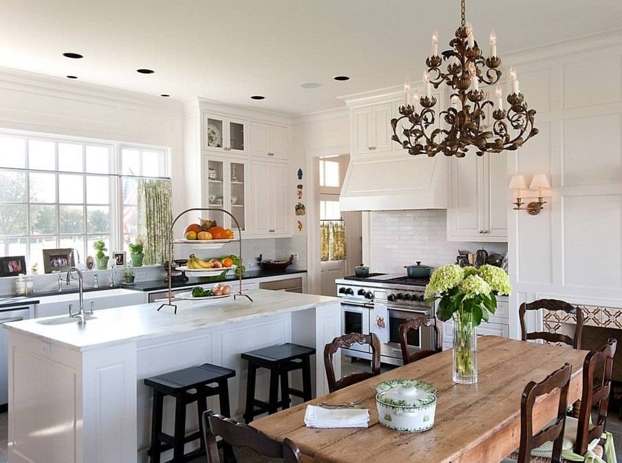 В частном доме, когда позволяет площадь, кухня расширяется зоной столовой с обеденным столом или островом. Оба варианта прекрасно вписываются в загородный дом.