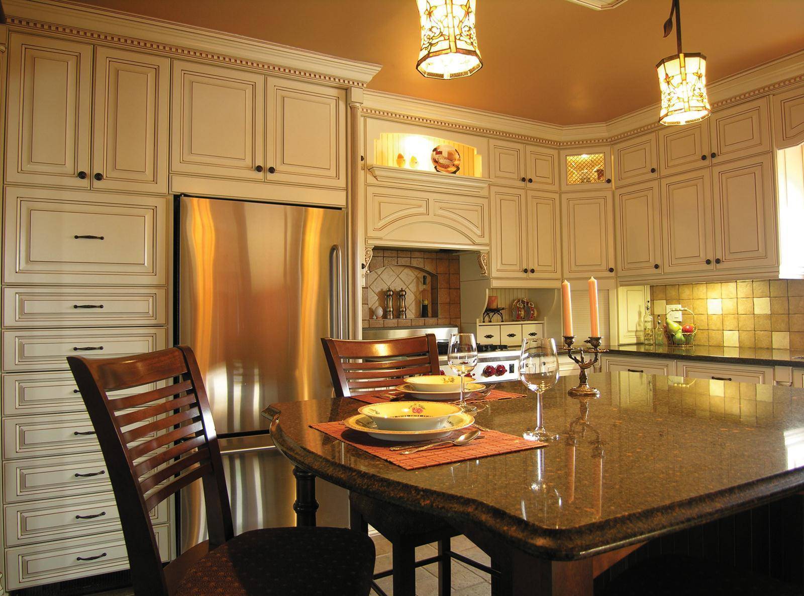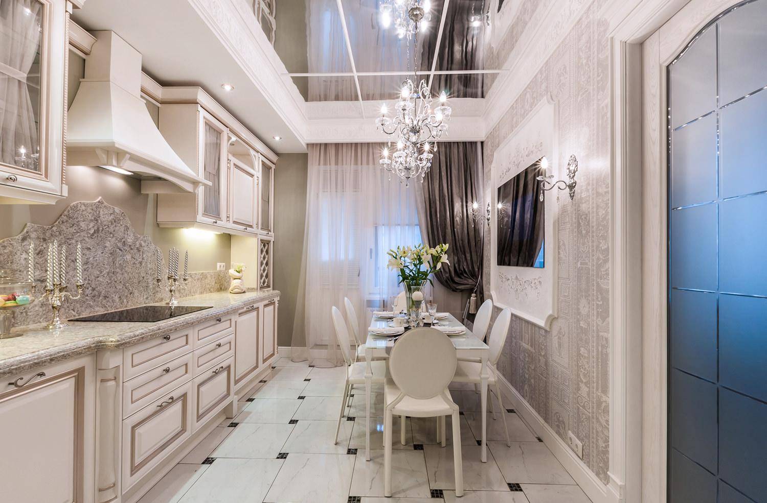 В современных интерьерах чаще отказываются от полноценной столовой зоны в пользу острова или барной стойки. В классических, напротив, устанавливают максимально функциональный кухонный гарнитур и большой обеденный стол для всей семьи.