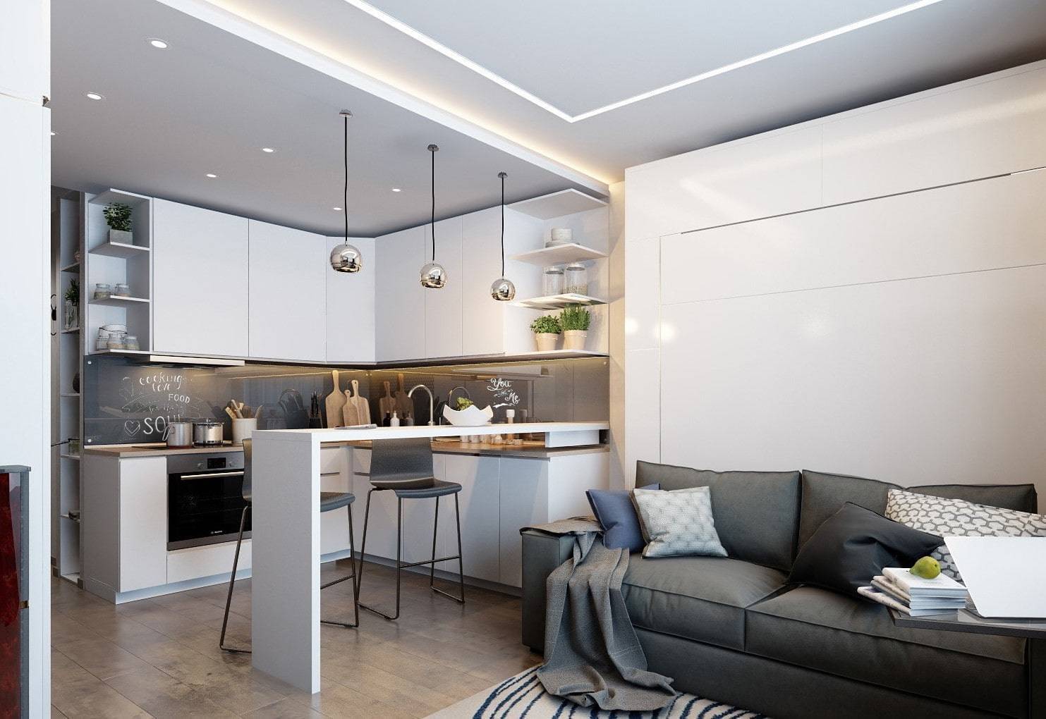 В дизайне кухни гостиной 36 или кухни-гостиной-столовой следует выбирать более компактные планировки, например, Г-образную (подходит для прямоугольных кухонь), двухрядную (для узкой комнаты) или линейную (в сочетании с остров / полуостров).