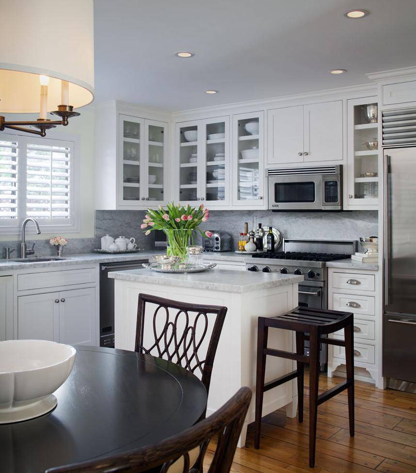 Проблема нехватки места заставляет тщательно выбирать самые необходимые для квадратной кухни предметы мебели. Изначально нужно определить что важнее: просторная рабочая зона для приготовления пищи или большой обеденный стол.