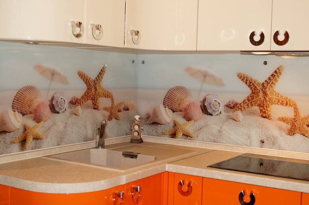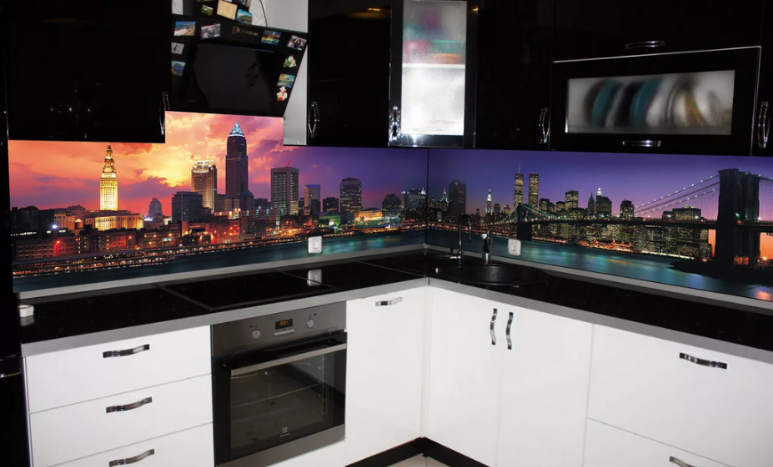 Фартук может быть глянцевым, с оригинальной фотопечатью или из плитки, клинкерной или мозаичного формата. Современные дизайнеры не рекомендуют устанавливать уголки в местах стыка фартука со столешницей, лучше эти места обработать силиконовым герметиком.