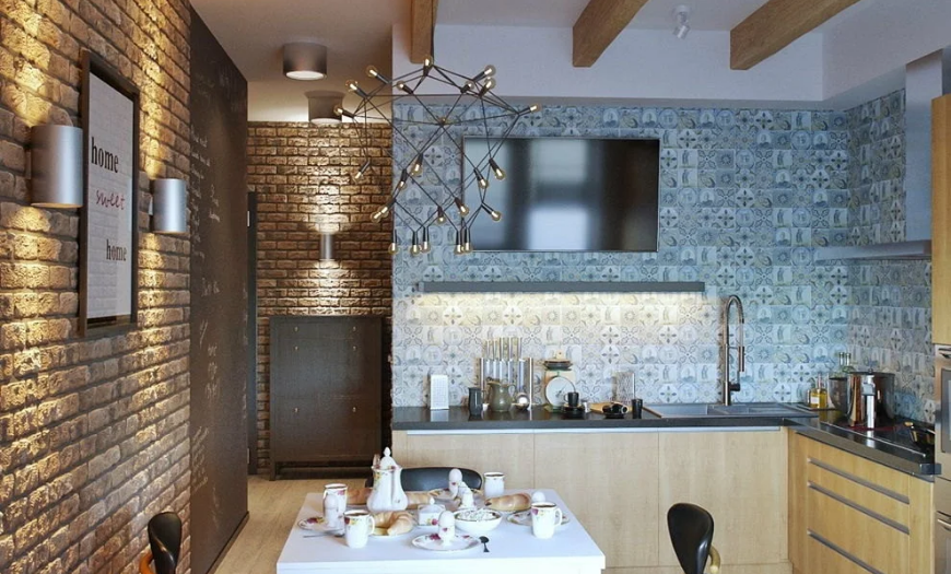 - Освещение. В каждой части квадратной кухни должны быть свои источники света, даже если в центре есть «главная» люстра. В столовой зоне это могут быть подвесные светильники, в уголке отдыха – настенные бра.