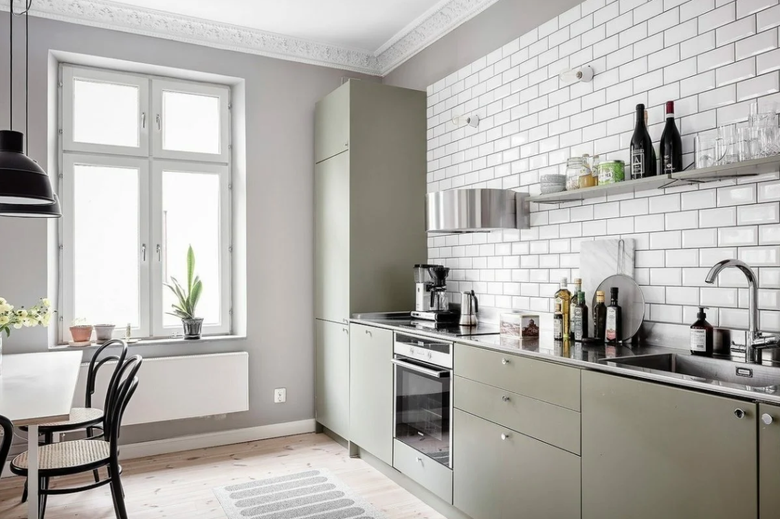 Например, фисташковая (или любая другая цветовая моно-гамма, которая контрастирует на фоне темных или светлых предметов мебели или техники). В этом варианте цветовая гамма отделяет рабочую зону от обеденной зоны.