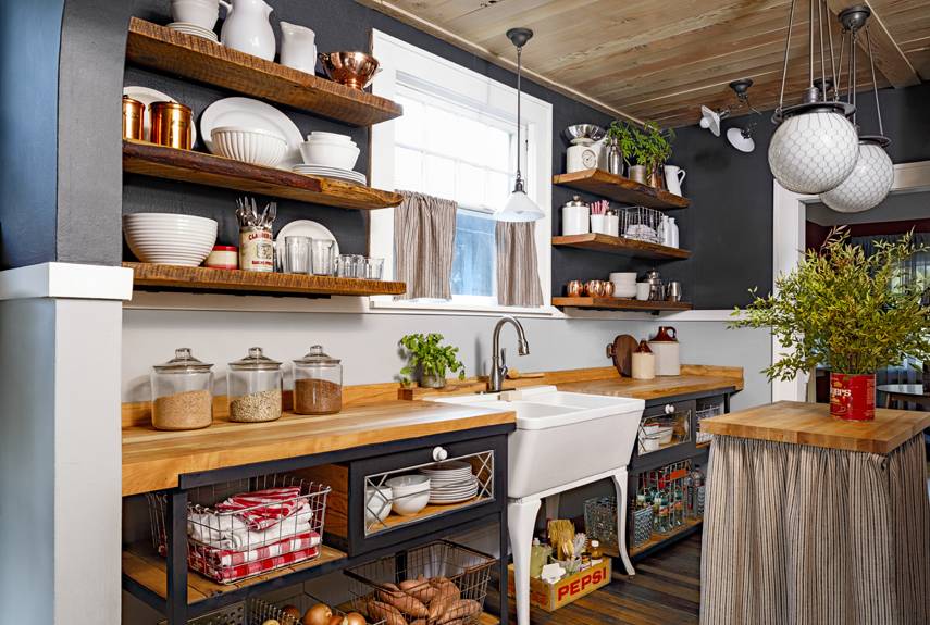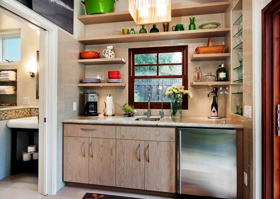 Открытые полки на кухне увеличивают визуально пространство