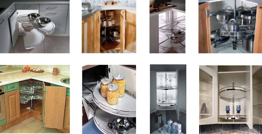 Полки-карусели обычно помещаются в угловых шкафах и увеличивают полезное пространство на кухне