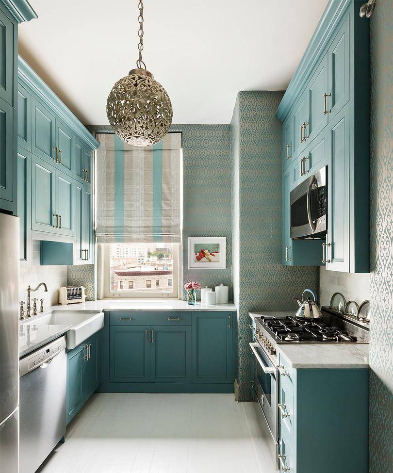 Чтобы отвлечь внимание от проблемных мест, нужен мощный цветовой удар! Яркий контраст лишит кухню эффекта загроможденного пространства. Достаточно выкрасить всего одну стену в сочный оттенок (например – бирюзовый), и помещение заиграет новыми красками